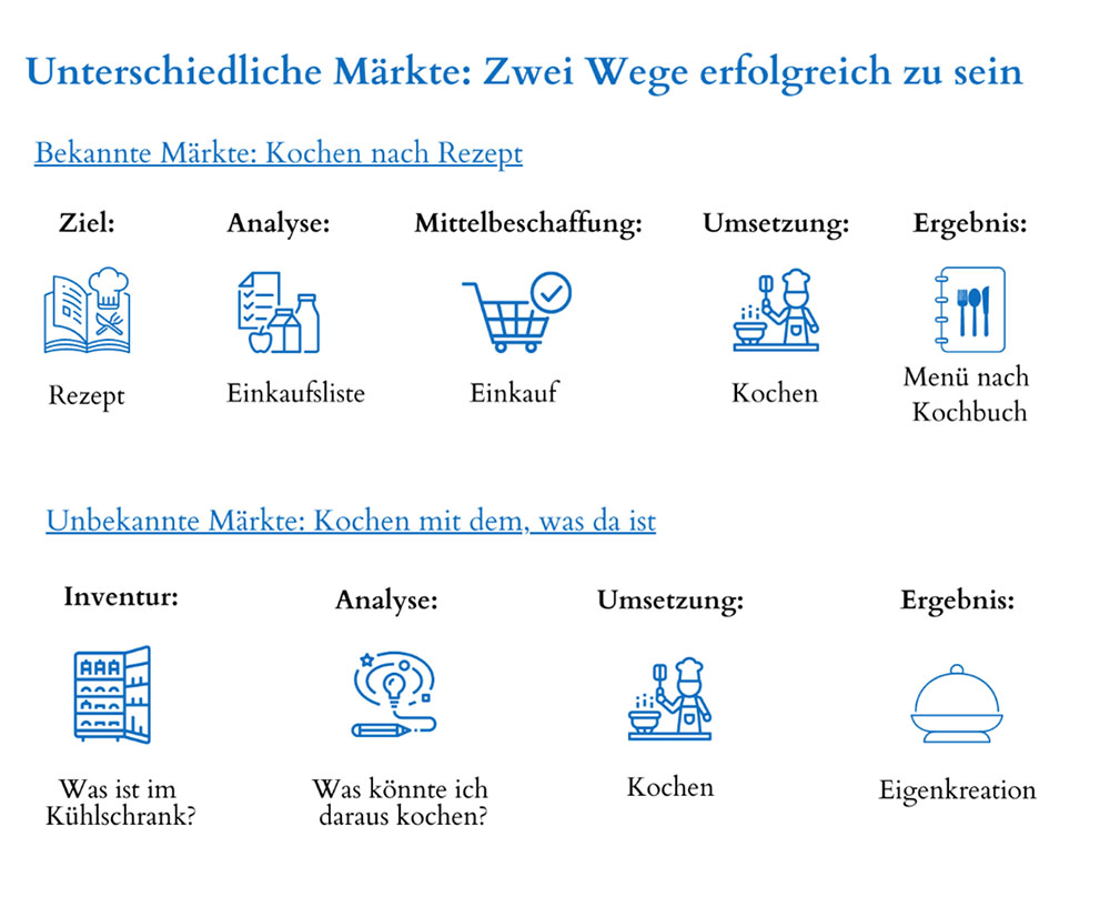Kern der Effectuation-Methode ist nicht vom Ziel auszugehen, sondern von den Mitteln, die du bereits hast. In der Küche würdest du dich also nicht fragen, was muss ich einkaufen, um ein Gericht zu kochen, sondern du würdest in den Kühlschrank schauen und überlegen, was sich aus den vorhandenen Zutaten Leckeres zaubern lässt.